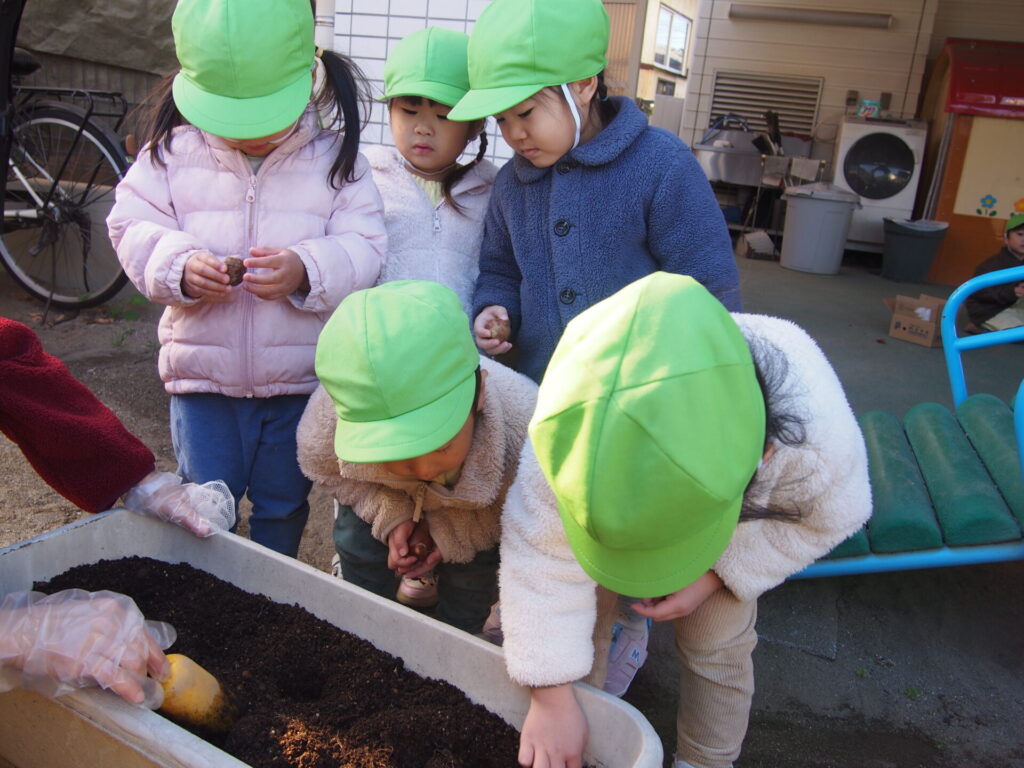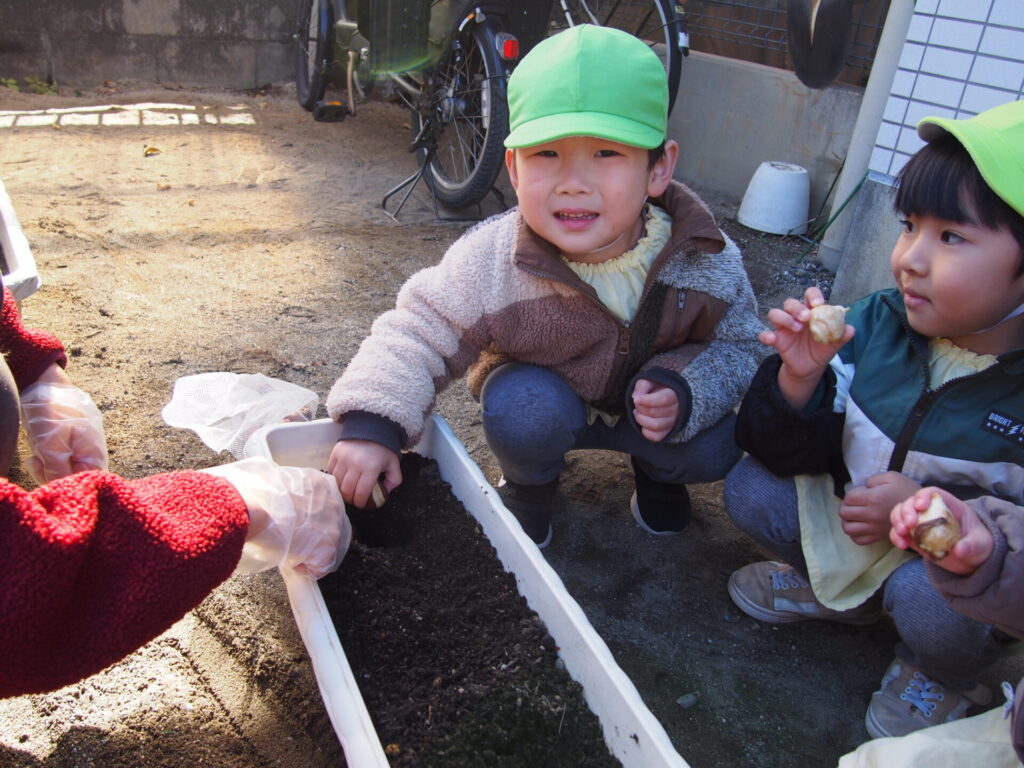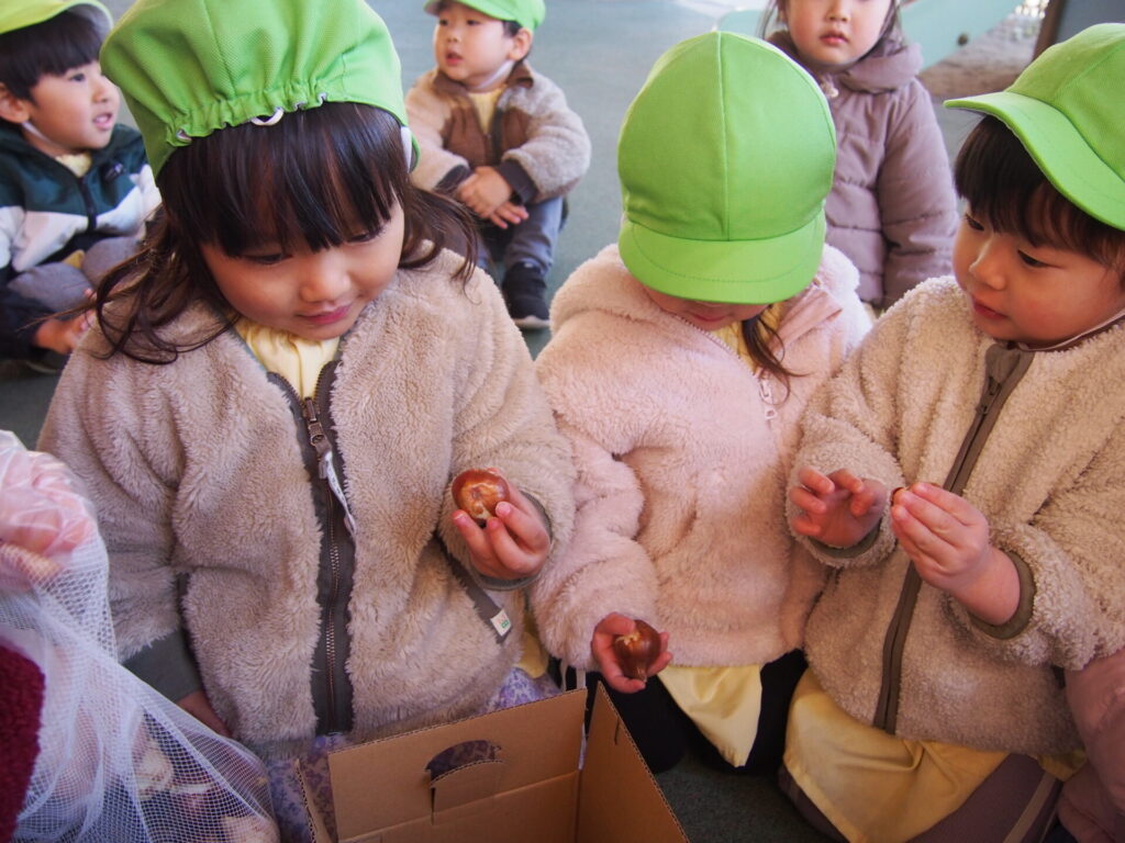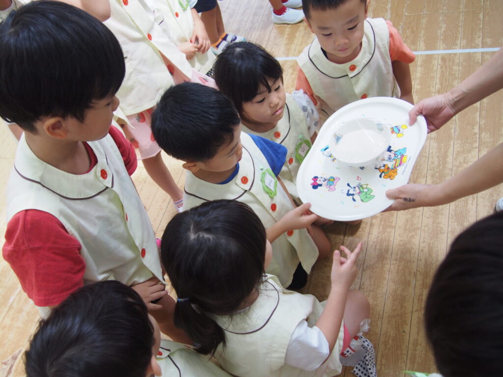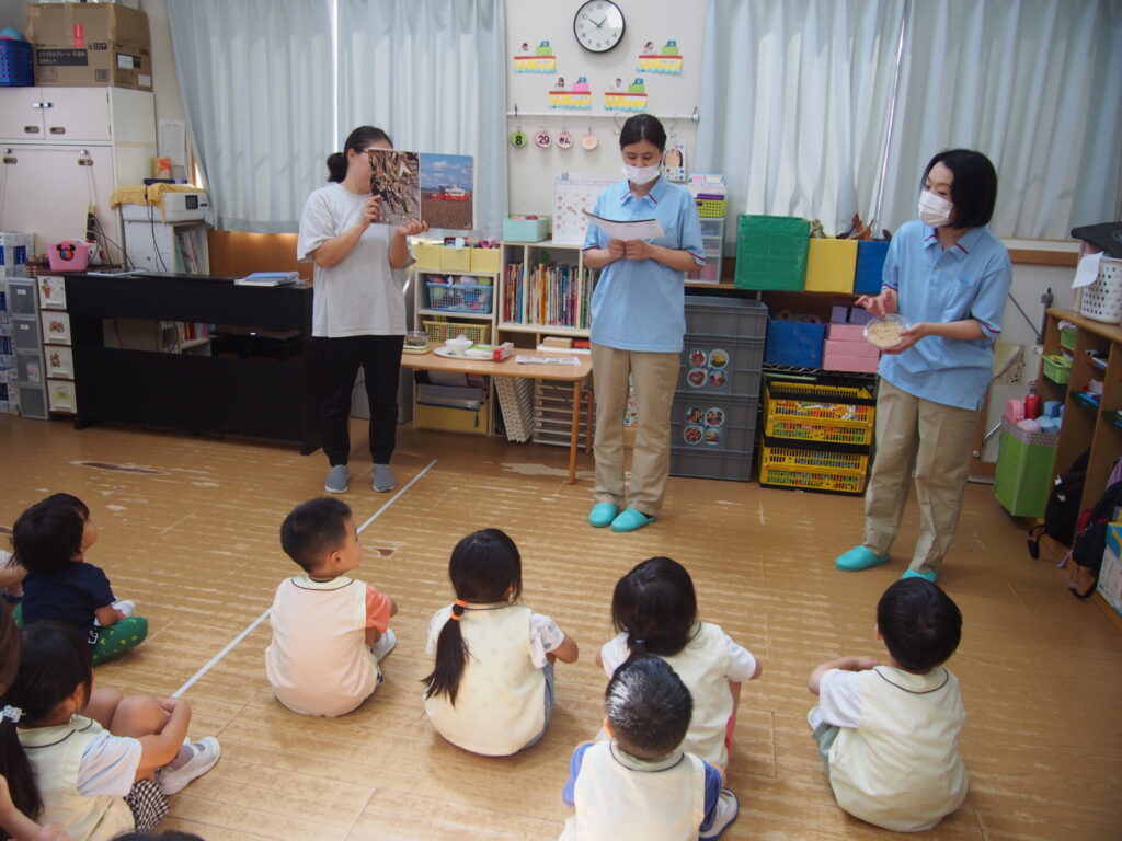 給食の先生がお部屋まで来てくれて大豆のことをたくさん教えてくれました。給食の先生が読んでくれた紙芝居では、『いつも自分たちが食べている豆腐はどうやってできているのか』を真剣な眼差しで見ていました。紙芝居の後に大豆でできている食べ物は何でしょう?の問いかけに積極的に答えてくれた子ども達。『豆腐!』『納豆!』の他に『ごはん!』という答えも😊今回の食育集会で大豆の事も学べましたが、給食を作ってくれている人が居ること、その食材を育てくれている人が居ることなど大切なことをたくさん学べました。